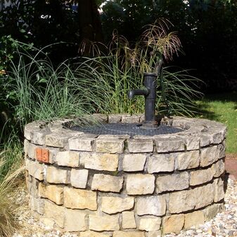 Pumpbrunnen mit gusseisernem Brunnenstock mit Schwengel und kreisrundem, aus Steinen gemauertem Brunnentrog. Der Brunnen wurde ca. 1985 wieder hergestellt. Schutzanstrich in schwarzer Farbe. Sehr gut erhalten, 63cm hoch, Durchmesser 158cm.
