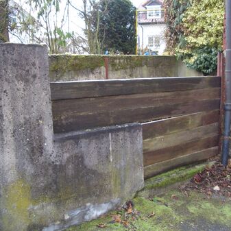 Dunglege, Miste, aus Beton, rechteckig. Die Hauswand bildet eine Seite der Dunglege. Wird nicht mehr genutzt. Gut erhalten, 61cm hoch, 292cm breit und 230cm tief.