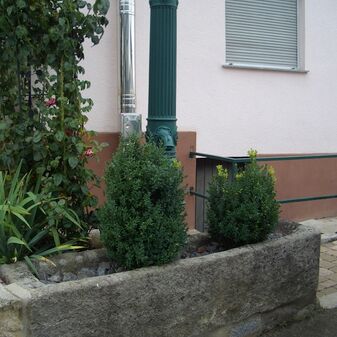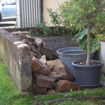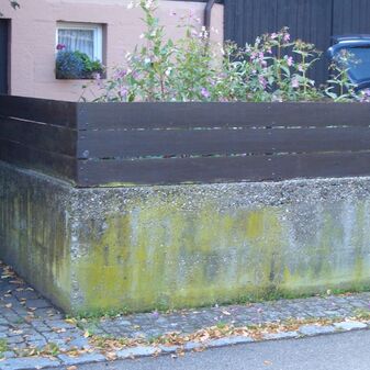 Dunglege, Miste, aus Beton mit Holzgeländer, mit Erde verfüllt und bepflanzt, rechteckig, sehr gut erhalten, 124cm hoch, 263cm breit und 354cm tief.