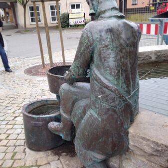 Moderner Laufbrunnen „Beerlesklopferbrunnen“ mit lebensgroßer Figur aus Kupferblech. Sie stellt einen Steinenbronner Bauer, der Wachholderbeeren stampft, in der Arbeitskleidung des 19. Jahrhundet dar. Rundes Sandbecken, gemauerte Rückwand mit Steinblöcken, Metallausguss und Metallplatte mit Inschrift, von 1988, entworfen von Rolf Weinhardt, Künstler aus Waldenbuch, finanziert durch die Sparkassen-Stiftung der Kreissparkasse Böblingen. Sehr gut erhalten, 260cm hoch, 270cm breit.