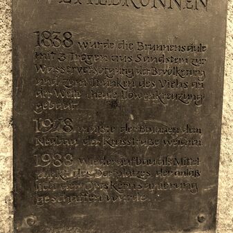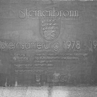 MDCCCXXXVIII / DER / WETTEBRUNNEN / 1838 wurde die Brunnensäule / mit 3 Trögen aus Sandstein zur / Wasserversorgung der Bevölkerung / und zum Tränken des Viehs an / der Wette (heute Löwenkreuzung) gebaut. / 1978 mußte der Brunnen dem / Neubau der Kreisstraße weichen. / 1988 Wiederaufbau als Mittel- / punkt des Dorfplatzes, der anläß- / lich der Ortskernsanierung / geschaffen wurde. // Steinenbronn / Ortskernsanierung 1978-1995 / Planung: Freier Architekt Ulrich Collmer, Gärtringen / Bauleitung: Ing. Büro Reicherter und Gonska, Eningen u.A. / Sanierungstreuhänder: / LEG