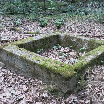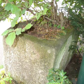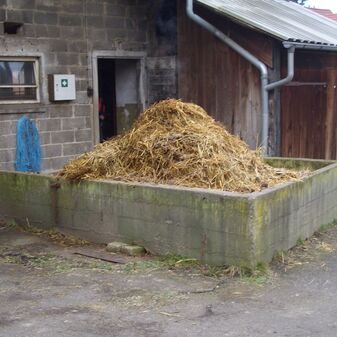Dunglege, Miste aus Beton, rechteckig. Wird nicht mehr genutzt. Befriedigend erhalten, 54cm hoch, 236cm breit und 215cm tief.