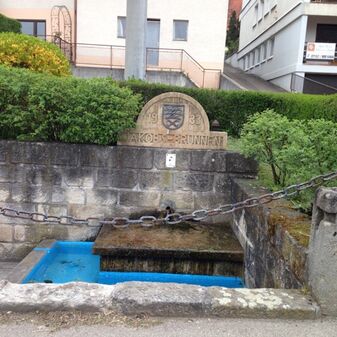 Laufbrunnen „Jakobsbrunnen“ von 1933 aus Terrazzostein mit schmiedeeisernem Gemeindewappen und Inschrift in halbrundem Abschluss, abgestuftes, viereckiges Becken. Sehr gut erhalten, 603cm breit und 313cm tief. Ursprünglich mit Hakenkreuz, das dann durch das Gemeindewappen ersetzt wurde, 1977 völlige Neugestaltung, erneuert 1992.