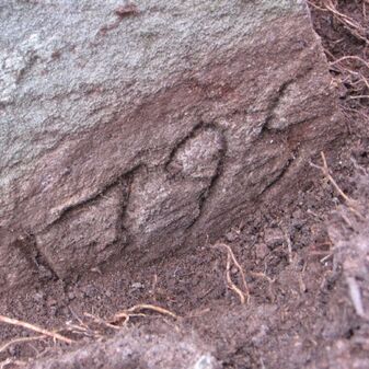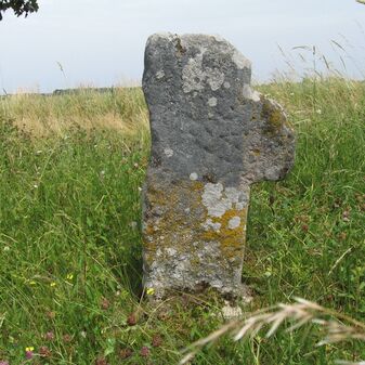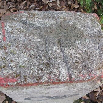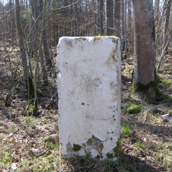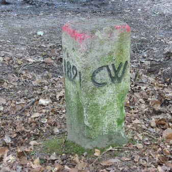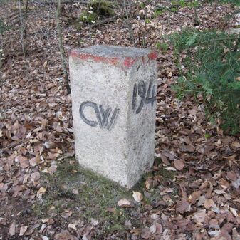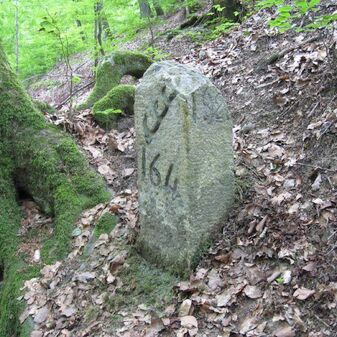 Grenzstein der Kommune Weil von 1821. Stein, rechteckige Grundform, beschädigter Kopf, an den Seiten Symbol Hirschstange, Buchstaben CW und Nummerierungen 1821, 164. Mangelhaft erhalten.