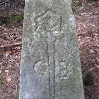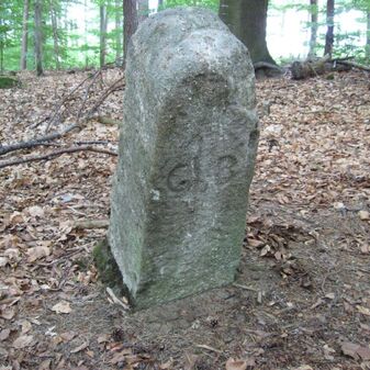 Grenzstein des Klosters Bebenhausen von 1795. Sandstein, rechteckige Grundform, flacher Kopf, an den Seiten Symbole Hirschstange und Abtsstab, Buchstaben C B sowie Nummerierungen NO 6 1795. Gut erhalten, 90cm hoch, 44cm breit, 24cm tief.