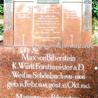 RUHESTÄTTE / der Familie / von BIBERSTEIN // Hugo von Biberstein / geb. 7. Aug. 1890 / gest. 28. Okt. 1892 // Pauline von Biberstein / geb. Feuerbach / geb. 29. Jan. 1854. gest. 27. März 1904 / Max von Biberstein / K. Württ. Forstmeister a. D. / Weil im Schönbuch 1881-1906 / geb. 18. Febr. 1848. gest. 15. Okt. 1913 / Marianne von Biberstein / geb. Lettenbaur / geb. 27. Aug. 1863. gest. 1. Jan. 1932 / Tod ist verschlungen in den Sieg / 1. Korinth.15.35 / Berta von Biberstein / geb. 6. Sept. 1887 / gest. 25. Apr. 1888