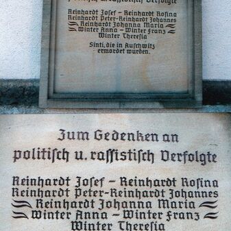 Zum Gedenken an / politisch u. rassistisch Verfolgte / Reinhardt Josef – Reinhardt Rosina / Reinhardt Peter – Reinhardt Maria / Winter Anna – Winter Franz / Winter Theresia / Sinti, die in Auschwitz / ermordet wurden.