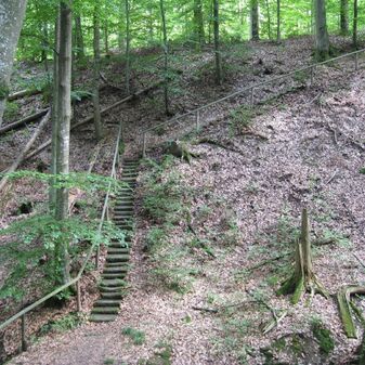 Zweiteilige Staffel bei der Brücke bestehend aus schlichten Steintreppenstufen und Holzgeländer. Gut erhalten; 49 und 31 Stufen.