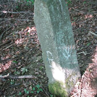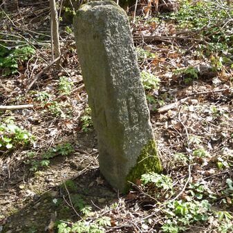 Grenzstein, dreieckige Grundform, Sandstein, gewölbter Kopf mit gerader Krinne, an den Seiten keine Inschrift.