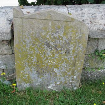 Grabstein, rechteeckige Steinplatte mit spitzem Abschluss und Inschrift (nicht lesbar) an der Friedhofmauer. Mangelhaft erhalten, 83cm hoch, 60cm breit.