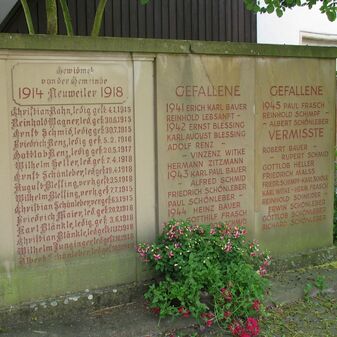 Gewidmet / von der Gemeinde / 1914 Neuweiler 1918 / Christian Rahm […] // Gefallene / 1941 Erich Karl Bauer […]