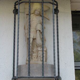 Hausfigur „Hl. Florian“ von 1976 am Feuerwehrhaus. Steinfigur des Heiligen mit Fahne beim Löschen eines Hauses. Ein Eisengitter schützt die Skulptur. Gut erhalten, 62cm hoch.