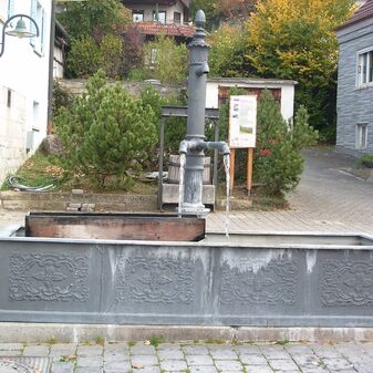 Laufbrunnen aus Gusseisen aus dem 19. Jahrhundert. Der Brunnenstock mit Ausguss ist leicht verziert, den sechseckigen Brunnentrog zieren florale Ornamente und Wappen. Gut erhalten, 2,2m hoch, 1,5m breit und 1,3mtief.