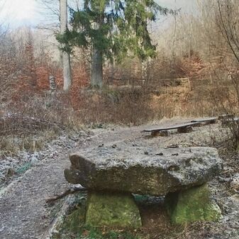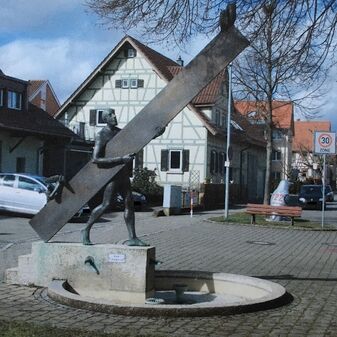 Der „Häseltrog“ [Häsel = Haselstrauch], ehemalig „Kindlesbrunnen“, ist ein Laufbrunnen bestehend aus zwei gestaffelt übereinander angebrachten, steinernen, längsrechteckigen Brunnenbecken und einer halbrunden, mit Kerben verzierten Stirnseite an der sich ein gusseisernes Ausflussrohr mit Tierkopf befindet. Er ist 118cm hoch, 185cm breit, 122cm tief und gut erhalten. Er wurde 1992 in dieser Form neugesetzt. Ursprünglich bestand die Anlage aus einem längsrechteckigen steinernen Brunnenbecken und einem niedrigen Brunnenhaus aus Steinplatten und einer kleinen Holztür, die mit einem schlichten Metallrohr verbunden waren, aus dem das Quellwasser floss. Das Wasser diente der Bewässerung der Viehweiden; zusammen mit dem Wasser des Kirchbrunnens fließt es in die Aich.