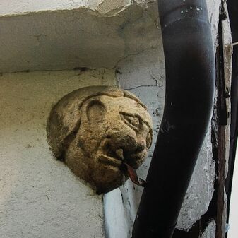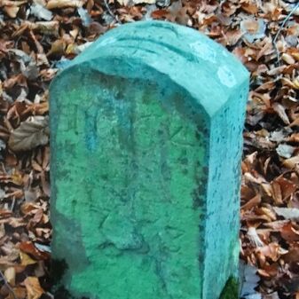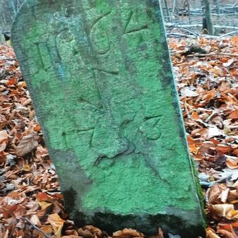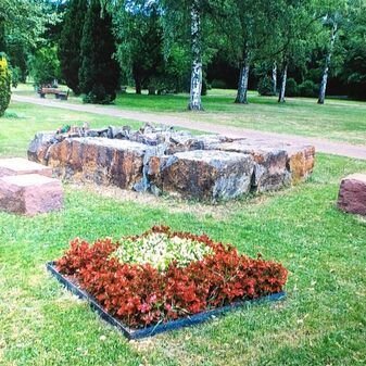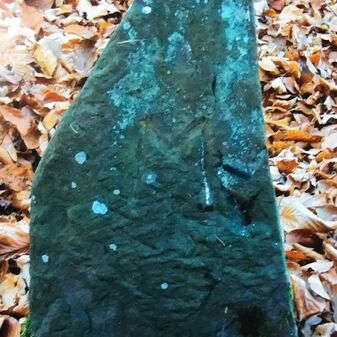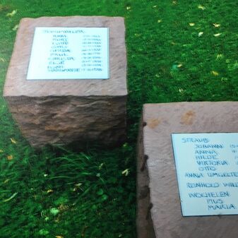 Gefallenendenkmal für sechs tote Soldaten der beiden Weltkriege, bestehend aus einem Tor aus Metall mit zwei Pfosten aus Sandstein, darauf Helme mit Eichenlaub sowie einem Gedenkstein mit Inschrift, Ornamenten, Schwert, Kreuz, zwei Pfeilern und Ranken und sechs Grabsteine mit den Namen und Lebensdaten der Verstorbenen. Gut erhalten, Gedenkstafel 1,75m hoch, 1,2m breit, 20cm tief.