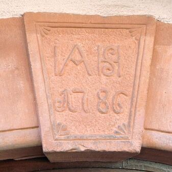 Bauinschrift von 1788 am trapezförmingen Keilstein des Türsturzes aus Sandstein. Initialen von Metzger Josef Eble. Gut erhalten, keine Maßangaben.